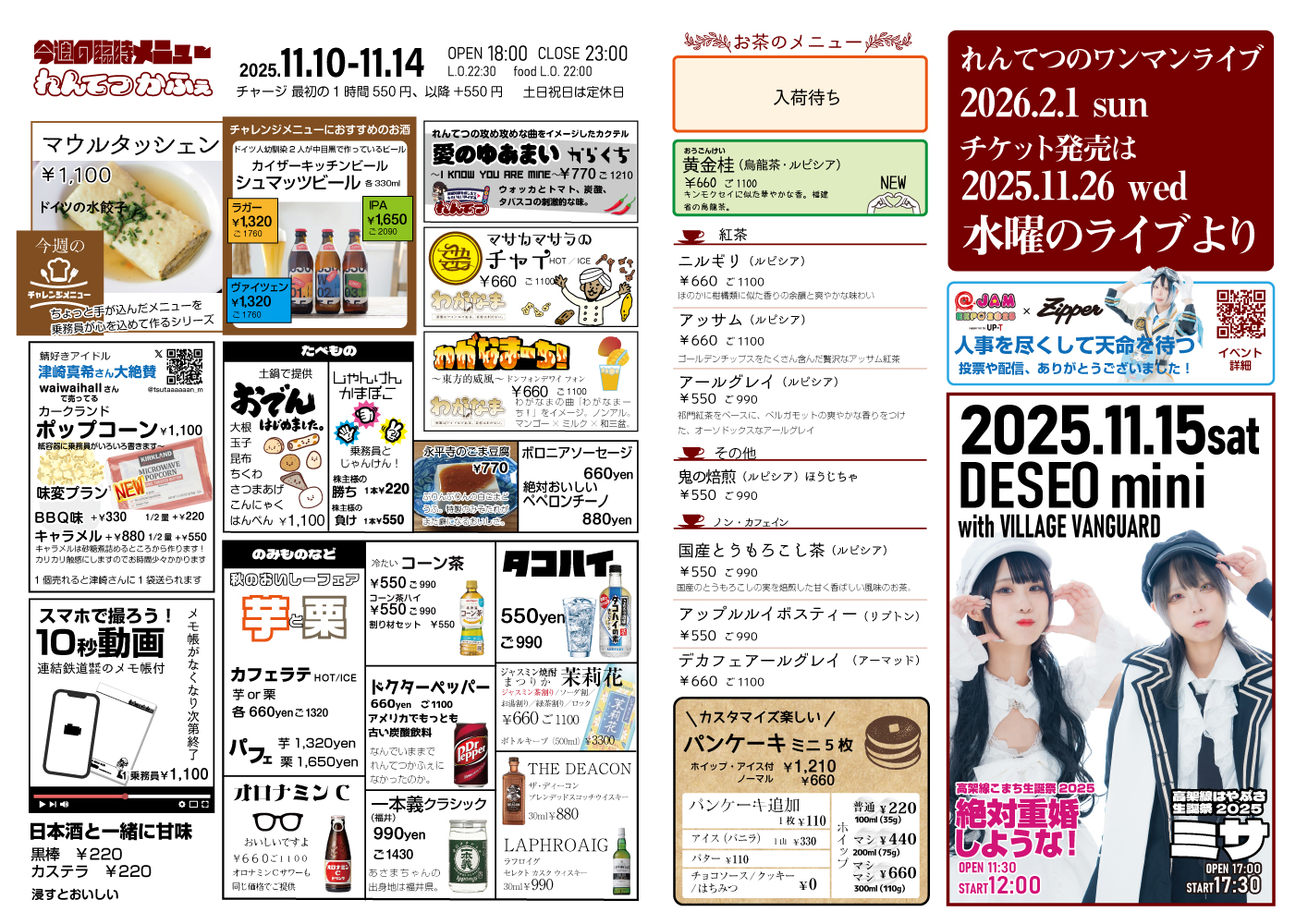 来週11/26(水)水曜のライブより、来年のれんてつワンマンライブチケットを発売いたします。チケットゲット最速のチャンス…!