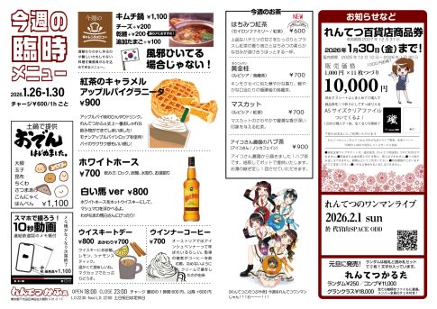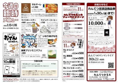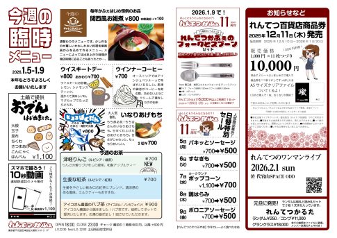 今週のメニュー新年あけましておめでとうございます🙌今年もよろしくお願いします✨ 2026年始まりましたね、どうもれんてつこです。元旦に発売されたれんてつかるたみんなゲットしたかな?2025年のれんてつを振り返られる内容になってますよ~...